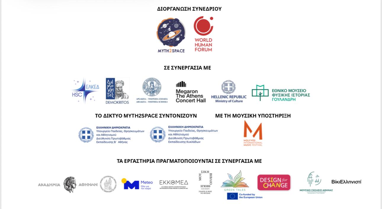 The conference is organised by the International Sustainability Education Network “From Mythology to Space – Myth2space” and the World Human Forum, in collaboration with the Hellenic Space Center, the National Centre for Scientific Research “Demokritos”, the Philekpaideftiki Etaireia (Arsakeia – Tositseia Schools), Megaron – The Athens Concert Hall, and the National Museum of Natural History Goulandris.